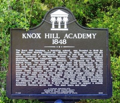 The Knox Hill Academy, a boarding school, was founded in 1848 by the Rev. John Newton (1814-1871), a Presbyterian minister whose motto was "You must learn and obey." The school was first located near a spring northeast of the Morrison Place on Knox Hill. The original sponsors of the school were the Campbells, McLeans, Gunns, Morrisons, Gillies, McCaskills, McPhersons, and McDonalds.
