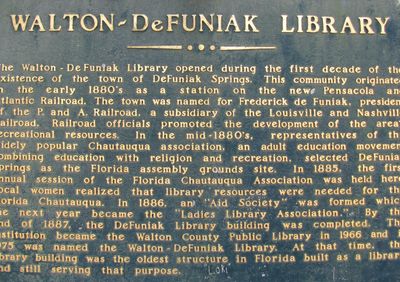 The Walton-DeFuniak Library opened during the first decade of the existence of the town of DeFuniak Springs. This community originated in the early 1880's as a station on the new Pensacola and Atlantic Railroad. The town was named for Frederick de Funiak, president of the P. and A. Railroad, a subsidiary of the Louisville and Nashville Railroad. Railroad officials promoted the development of the area's recreational resources. In the mid-1880's, representatives of the widely popular Chautauqua association, an adult education movement combining education with religion and recreation, selected DeFuniak Springs was the Florida assembly grounds site. In 1885, the first annual session of the Florida Chautauqua Association was held here. Local women realized that library resources were needed for the Florida Chautauqua. In 1886, an "Aid Society" was formed which the next year became the "Ladies Library Association." By the end of 1887, the DeFuniak Library building was completed. The Institution became the Walton County Public Library in 1966 and in 1975 was named the Walton-DeFuniak Library. At that time, the library building was the oldest structure in Florida built as a library and still serving that purpose.